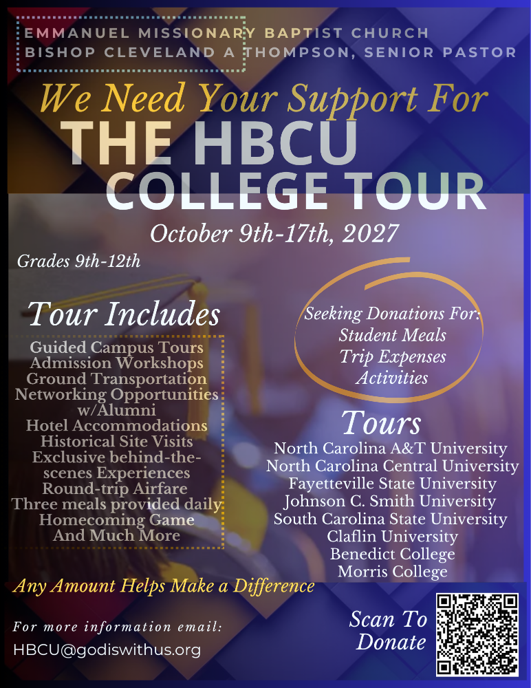 The Emmanuel Missionary Baptist Church (EMBC) Historically Black Colleges and Universities Tour is a biennial visit to historic institutions of learning. Our objective is to inspire 9th–12th grade students to pursue a college education by exposing them to the academic and social environment available at HBCUs.