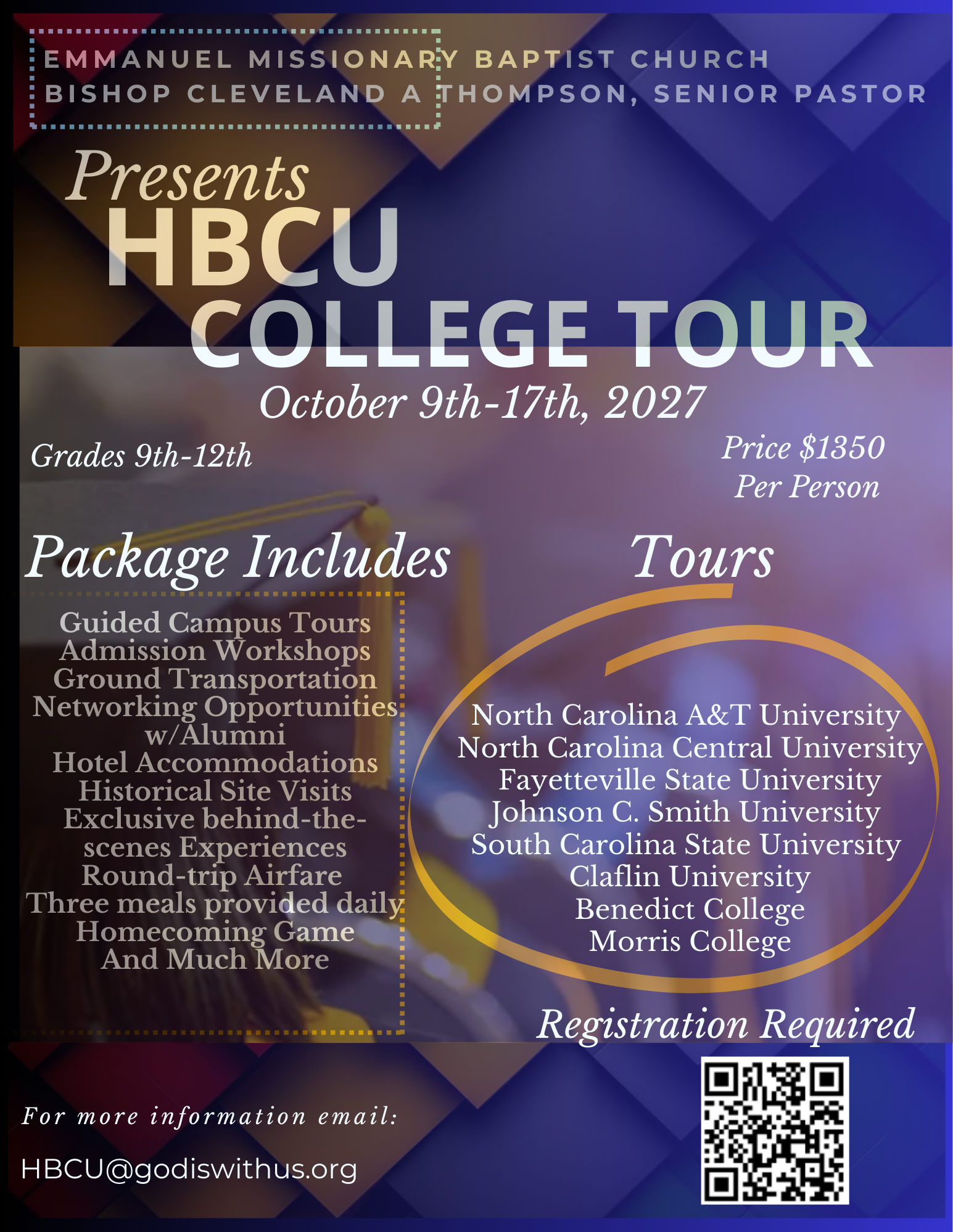 Registration is open for all 9th–12th grade students for the October 2027 HBCU college tour, taking place October 9th–17th, 2027.